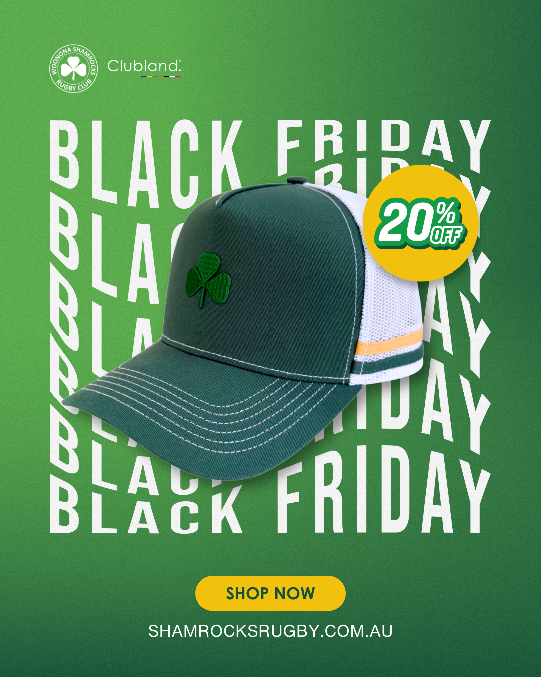 Show your Shammies pride this Black Friday with 20% OFF our premium trucker caps! These aren't just caps – they're a badge of honour for the Shamrocks family. Featuring official team colours, embroidered shamrock emblem, and quality construction built to last. Perfect for the game, summer days, or as Christmas gifts for fellow supporters. Use code BLACKFRIDAY at checkout ⏰ Sale ends after Cyber Monday – don't miss out! SHOP NOW