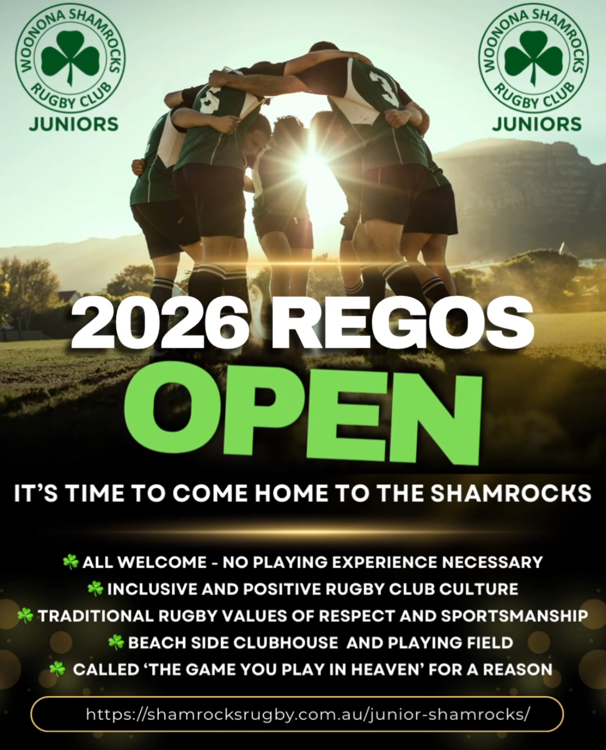 Shamrocks Junior Rugby Union Regos are now open for the 2026 season 🙌🏼. Link is in our Bio. An EARLYBIRD DISCOUNT of $40 off rego fees is on offer until 4 February💰 We warmly welcome new and returning players to join our Club. Information about the 2026 Junior Rugby season is on our Juniors Club webpage.